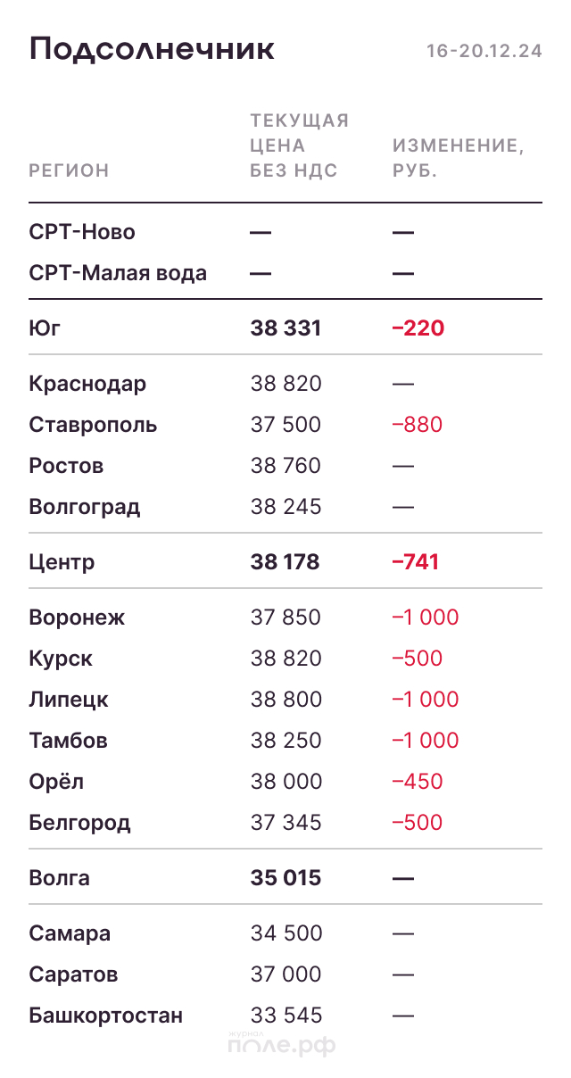 Ликвидность на внутреннем рынке постепенно сводится к минимуму. В числе игроков, которые по-прежнему продолжают приобретать семечку, остаются заводы, еще не выполнившие месячный план по закупкам. До конца декабря отдельные переработчики будут стараться законтрактовать доступные партии на рынке, однако с учетом текущей конъюнктуры и настроений фермеров количество сделок, вероятно, будет не очень большим. Большинство предприятий выходит с предложениями ниже 40 тыс. рублей за тонну без НДС (CPT), но аграрии пока еще не готовы работать по таким уровням и рассчитывают на повышение закупочных цен ближе к январю-февралю 2025 года. Маслозаводы в свою очередь уже переключаются на новые январские контракты по маслу с учетом более высокой пошлины и, как следствие, готовятся к дальнейшему снижению стоимости сырья. Однако котировки семечки в перспективе может поддержать высокий спрос среди переработчиков после завершения новогодних праздников, а также курс доллара. Тем не менее при текущей и ожидаемой в течение января стоимости готовой продукции говорить об увеличении рублевых цен на подсолнечник в краткосрочной перспективе не приходится.
