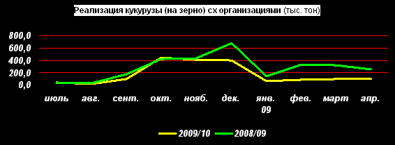За апрель 2010г. сельхозорганизации РФ, по данным Росстата, реализовали 102,468 тыс. тонн кукурузы на зерно. Это почти на 60% меньше, чем за апрель прошлого года. Следует только отметить, что тренд торговой активности февраль-март 2009г. был нисходящий, сейчас же он – слегка восходящий.