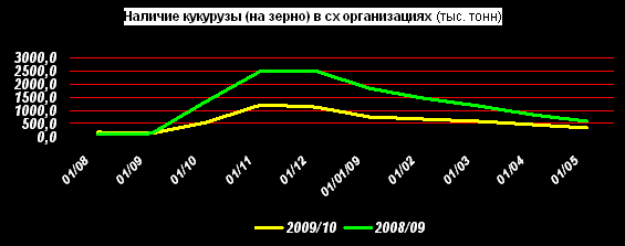 Запасы кукурузы (на зерно) в сельхозорганизациях на 01 мая 2010г. составили 335,028 тыс. тонн или на 42,3% меньше, чем на 01 мая прошлого года.