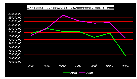 Производство подсолнечного нерафинированного масла в России в июле, по данным Росстата, оставило 146,3 тыс. тонн. Это почти на 30% ниже июньского показателя и почти на 25% ниже объёмов производства в июле 2009 года.