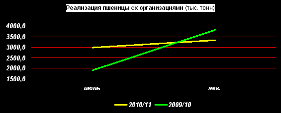 В августе 2010г. сельхозорганизации РФ, по данным Росстата, реализовали 3337,518 тыс. тонн пшеницы, что на 12,6% меньше, чем в августе 2009г.