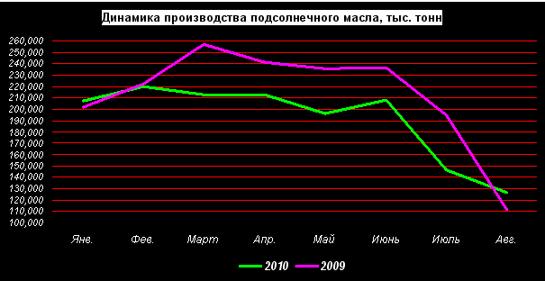 Производство подсолнечного нерафинированного масла в России в августе, по данным Росстата, составило 126,8 тыс. тонн. Это на 13,3% ниже июльского показателя, но почти на 12% выше объёмов производства в августе 2009 года.