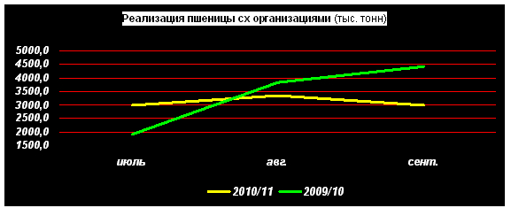 В сентябре 2010г. сельхозорганизации РФ, по данным Росстата, реализовали 2978,70 тыс. тонн пшеницы, что на 32,3% меньше, чем в сентябре 2009г. Но мы видим не только погодовое, но и помесячное снижение продаж «август-сентябрь», что происходит крайне редко и последний раз наблюдалось только в сезоне 2007/08. В сентябре 2010г. пшеницы было продано почти на 11% меньше, чем в августе 2010г.