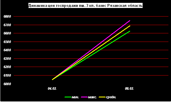 На торгах был выкуплен весь объем продовольственной пшеницы. Диапазон максимальных цен закупки составил 6075-6850 руб./тонна, диапазон минимальных цен 6050-6850 руб./тонна. Более-менее серьезная борьба состоялась лишь на базисах Орловской, Рязанской и Воронежской областей. В результате стартовые цены были превышены на 425 руб./тонна, 750 руб./тонна и 750 руб./тонна соответственно (04 февраля максимальное превышение было 500 руб./тонна).