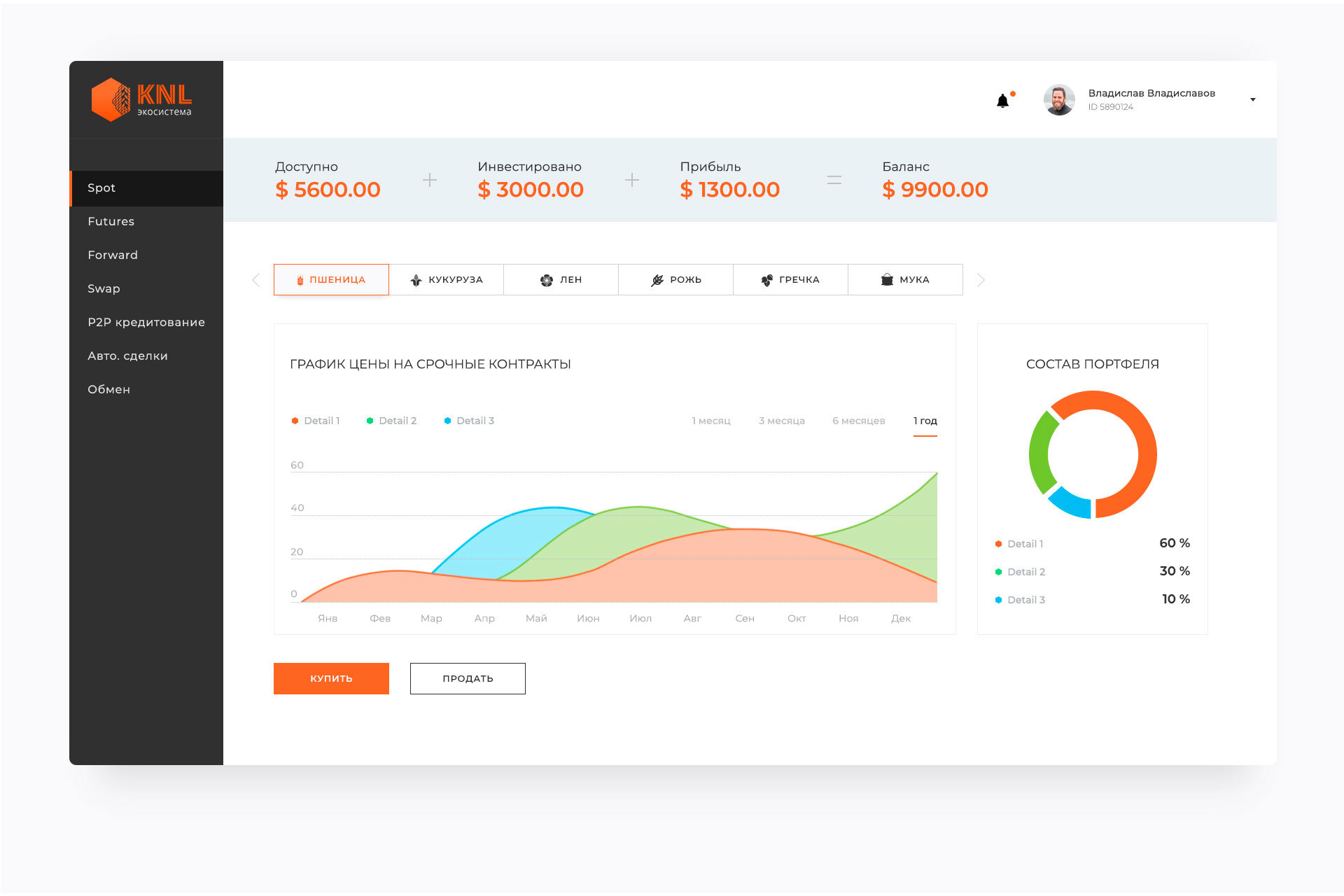 Одно из главных нововведений KNL — товарная биржа с понятным для фермера интерфейсом. Она позволяет фермеру получить оборотные средства при помощи финансовых инструментов, таких как фьючерс, форвард и своп. Помимо этого производитель может сбыть свою продукцию при помощи платформы.